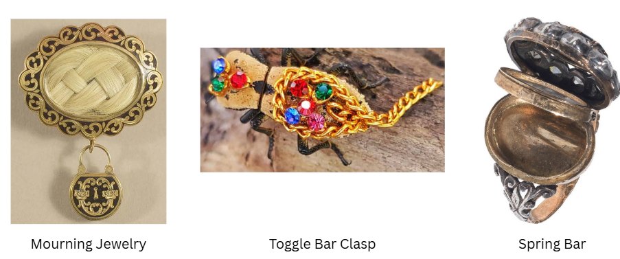 - Mourning Jewelry: We’ve covered this in a previous blog, but it deserves a mention here as well. In Victorian times, it became a trend inspired by Queen Victoria mourning her husband, Prince Albert. The wealthy followed her lead with lockets, bracelets, necklaces and rings to memorialize their loved ones. Materials included jet, onyx, pearls, dark tortoise shell, black enamel, bog oak, vulcanite, hair and gutta percha (natural rubber made from the Southeast Asian tree). Many of the materials had a specific meaning, for example, jet symbolized grief and mourning due to its deep black color while bog oak represented strength and endurance. Inclusion of hair and sometimes teeth into jewelry was very popular as it was believed to contain a bit of the essence of the person.